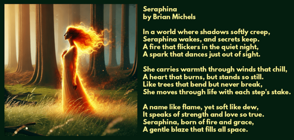 About my Seraphina poem: I lost my phone & case, had all my cc’s, id’s, cash, & other stuff. A lady contacted me, wanted to return it. When my wife and I picked it up, she was in her twenties, quite beautiful, nice as can be. Her name was Seraphina. She rejected a cash reward, told me she liked poetry, and wanted a poem instead.